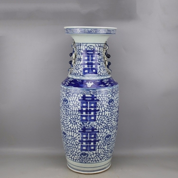民国手工瓷青花狮耳大号喜字瓶,高58厘米,肚24厘米