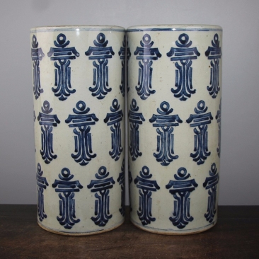 青花百寿字帽筒一对,高28厘米,口直径13.3厘米,底直径12.