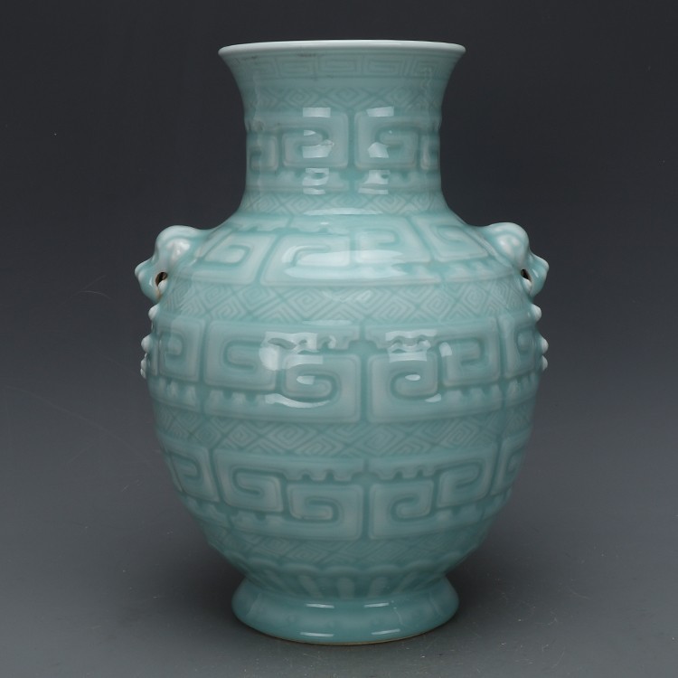 豆青釉刻花狮耳尊